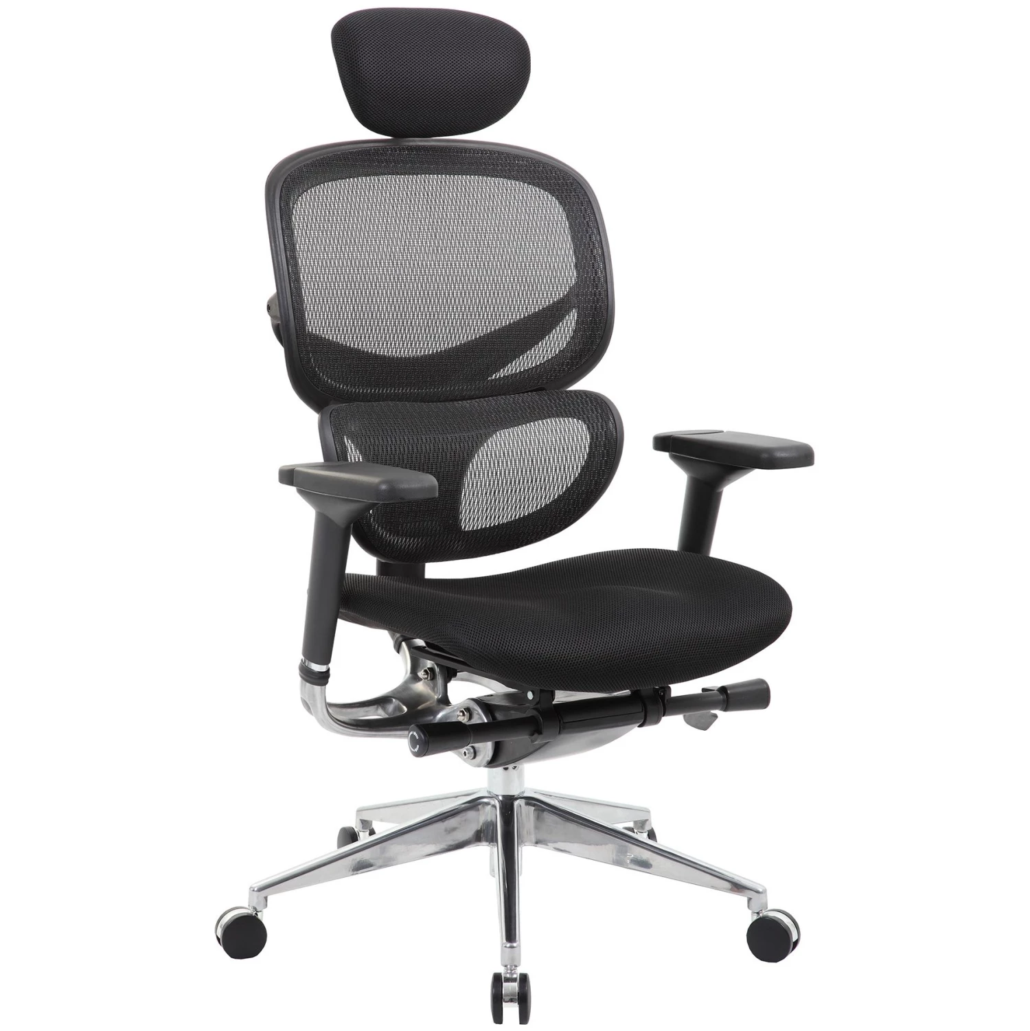 - Adjustable tilt padded airmesh headrest supports the head and neck.