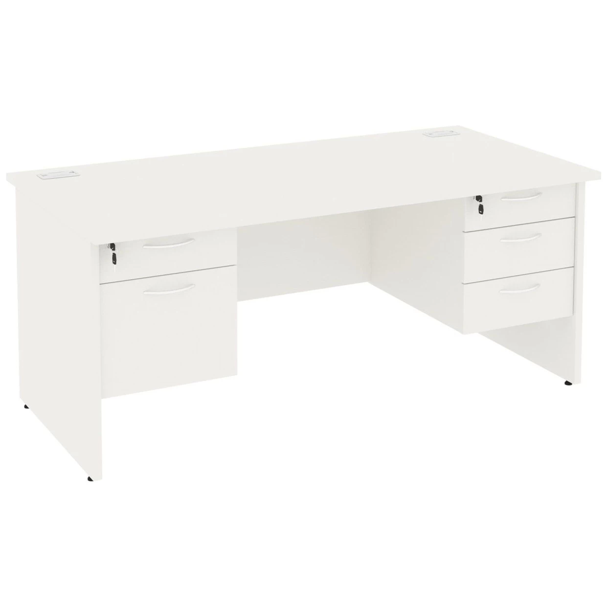 - Includes matched white fixed pedestals, each with 2 or 3 drawers
