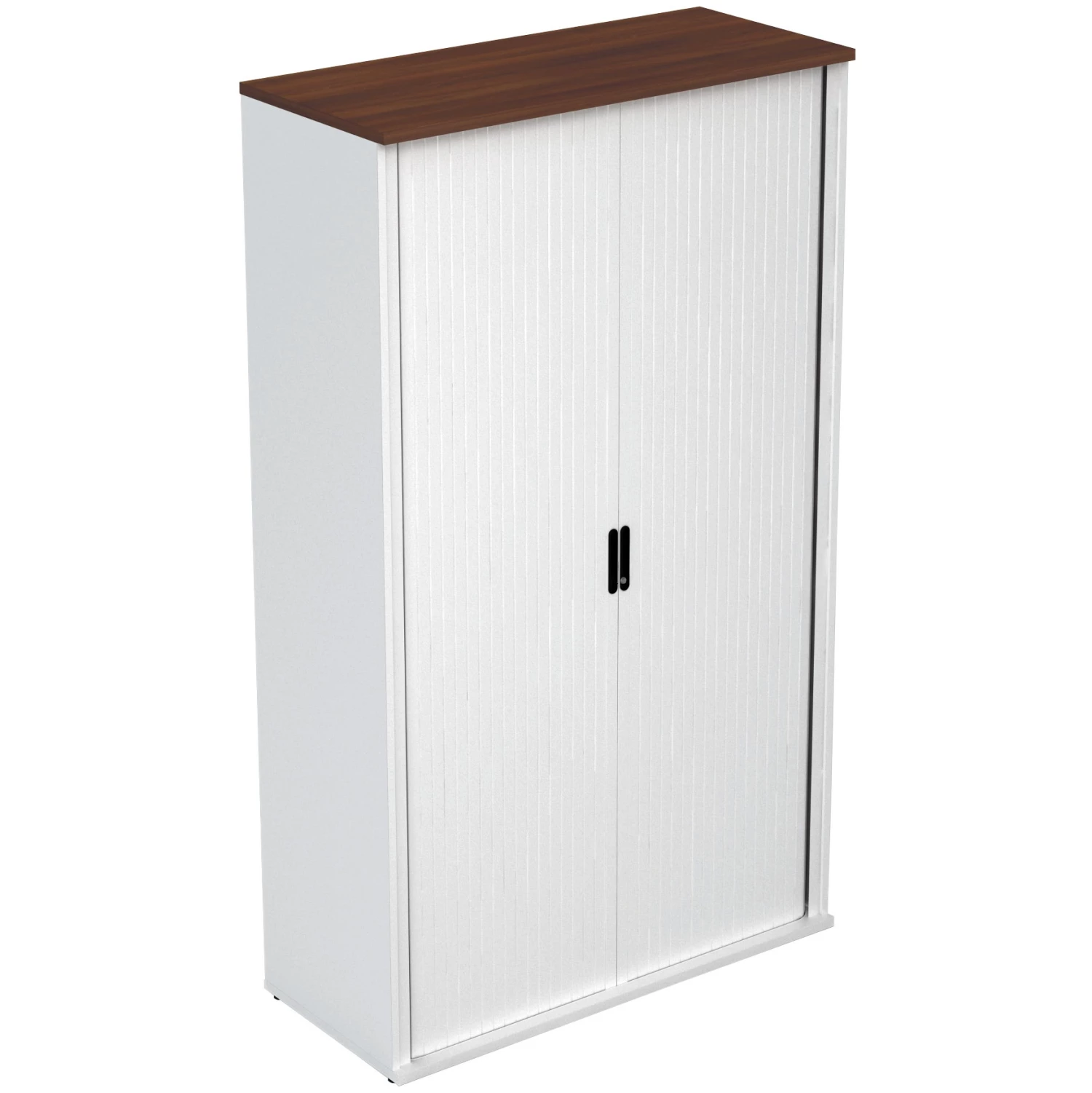 - Smooth action side tambour sliding doors in coordinating finish with recessed handles